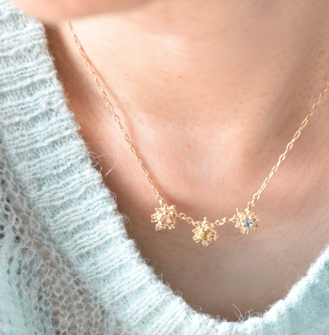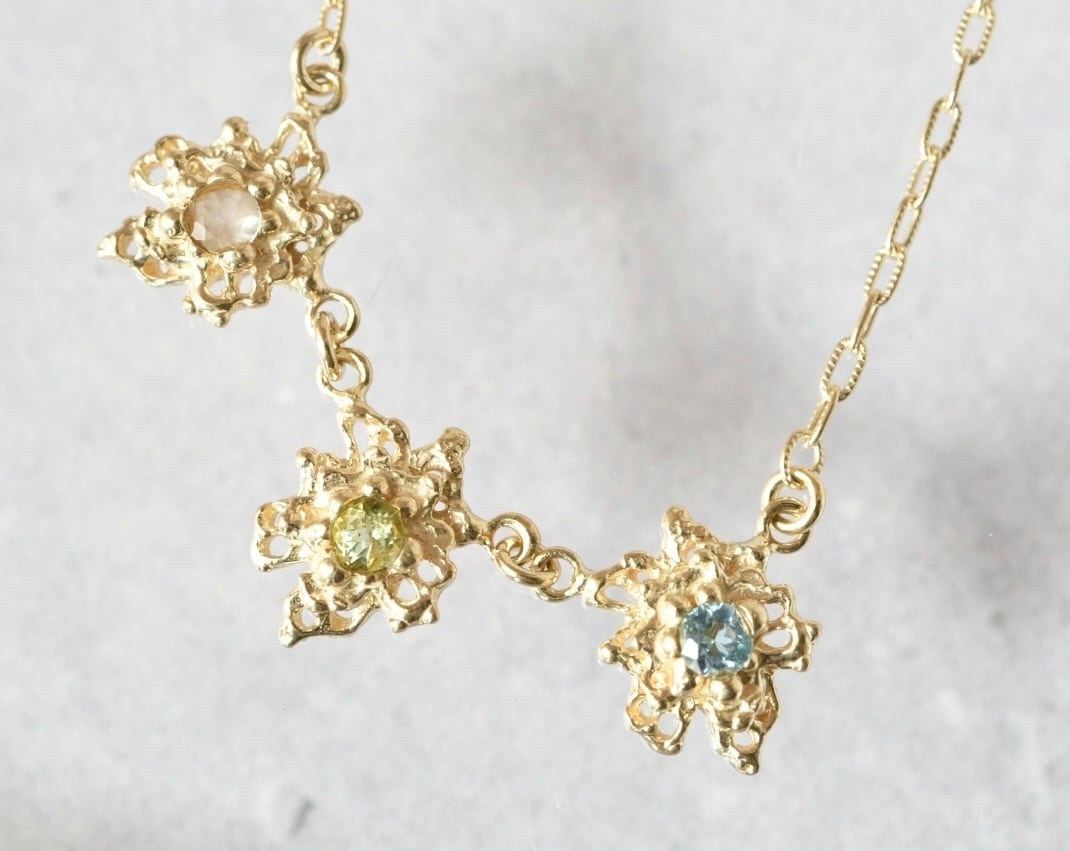 レースのような繊細なデザインで、3色の違った天然石がはめ込まれているのが華やかなアイテムです。